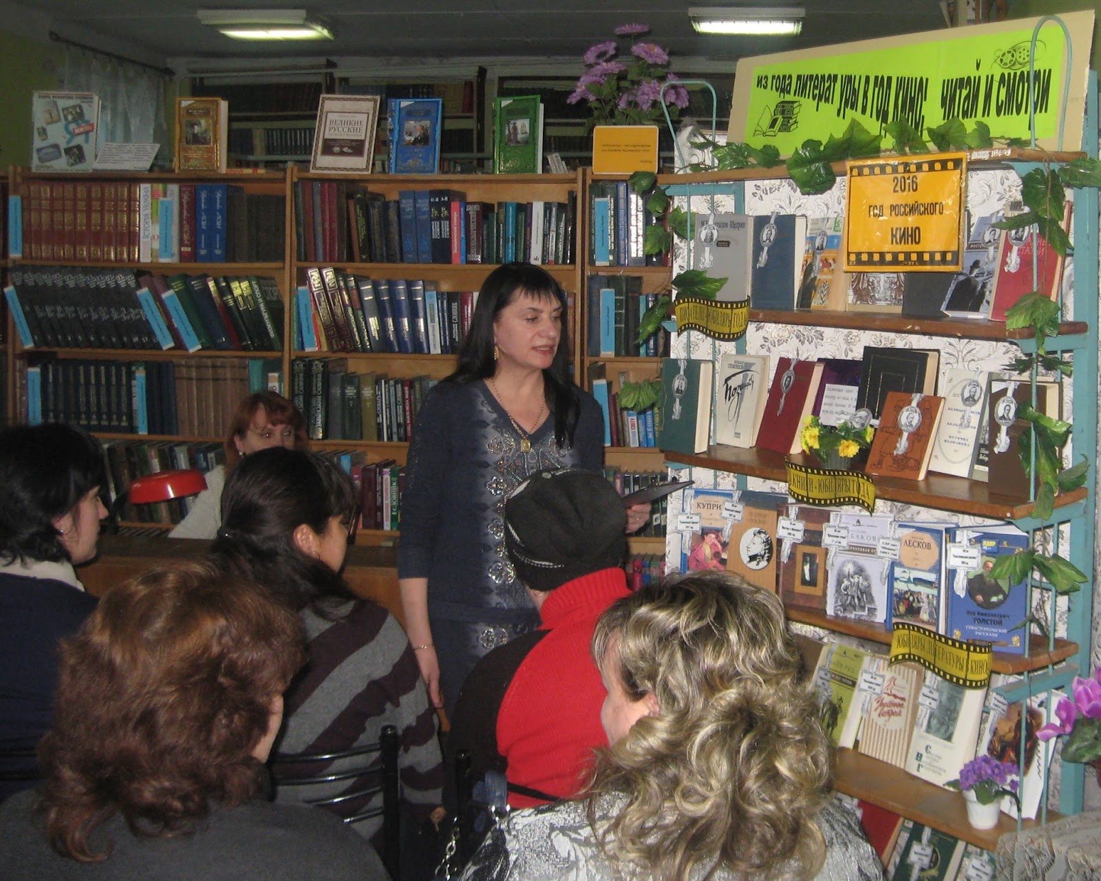 Вместе с заведующей отделом обслуживания Данильченко Л.М. и библиотекарем читального зала районной библиотеки Кологреевой А.О. присутствующие совершили увлекательное путешествие по выставке «Из Года литературы в Год кино: читай и смотри», на которой были представлены книги разного жанра (мелодрамы, комедии, боевики, вестерны, сказки), позволяющие увидеть любимых актёров на печатных страницах, проследить за судьбами героев в книжном варианте, сопоставить с режиссёрской работой. Выступление сопровождалось слайд-презентацией «Книги-юбиляры 2016 года».