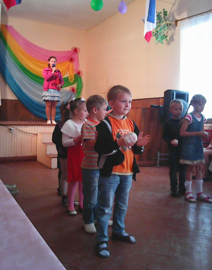 Первый конкурс программы был танцевальный- «Если весело живётся», в котором дети с удовольствием повторяли танцевальные движения, лучшие танцоры получили сладкие призы. Второй конкурс – «Вытащи репку» , здесь дети показали силу и командную сплочённость. Третий конкурс – «Шарик по кругу», в этом конкурсе ребята демонстрировали свои актёрские таланты.