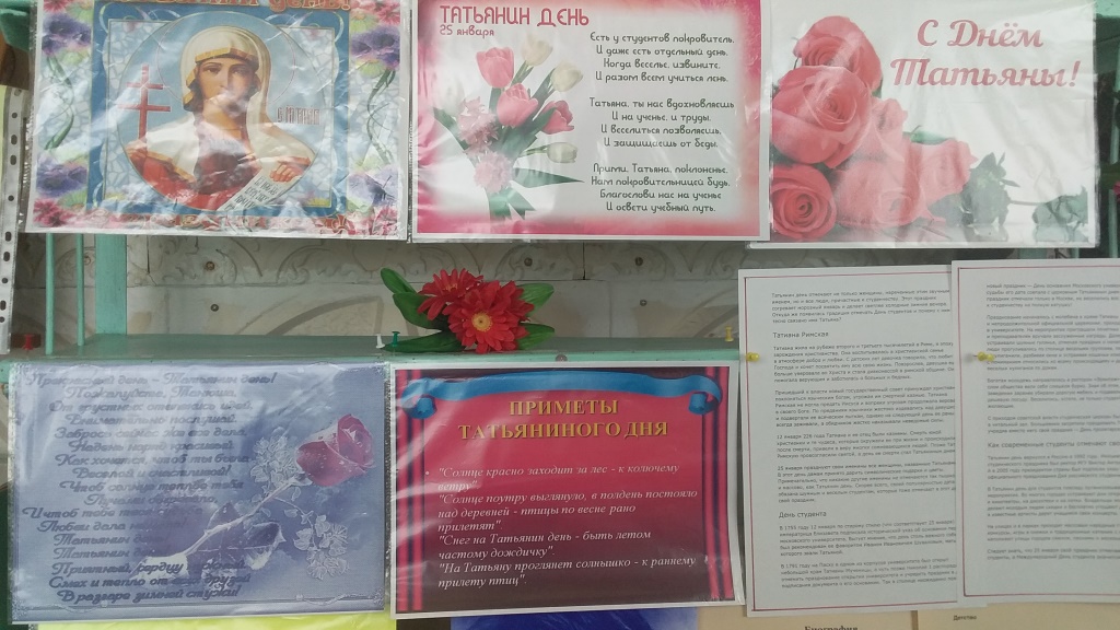 25 января в Чайкинской библиотеке была проведена беседа «Татьянин день - история и современность». Из рассказа библиотекаря присутствующие узнали, что 25 января -Татьянин день. День всех студентов. Вероятно, это единственный в истории случай, когда на один и тот же день претендуют и служители церкви и студенчество, причем каждая сторона понимает праздник на свой манер. Узнали историю святой Татианы Римской, значение имени «Татьяна».