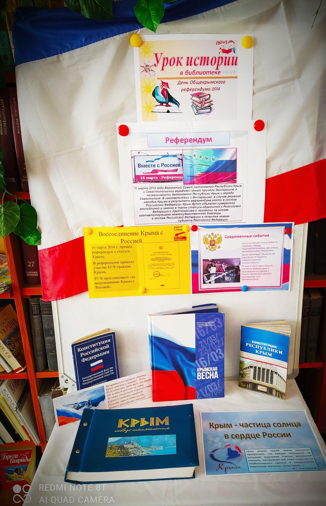 Библиотекарем Якименко Л.В. был оформлен тематический стенд «Крым. Референдум 2014 года». Она кратко рассказала о событиях 2014 года, о референдуме, на котором жители Крыма про