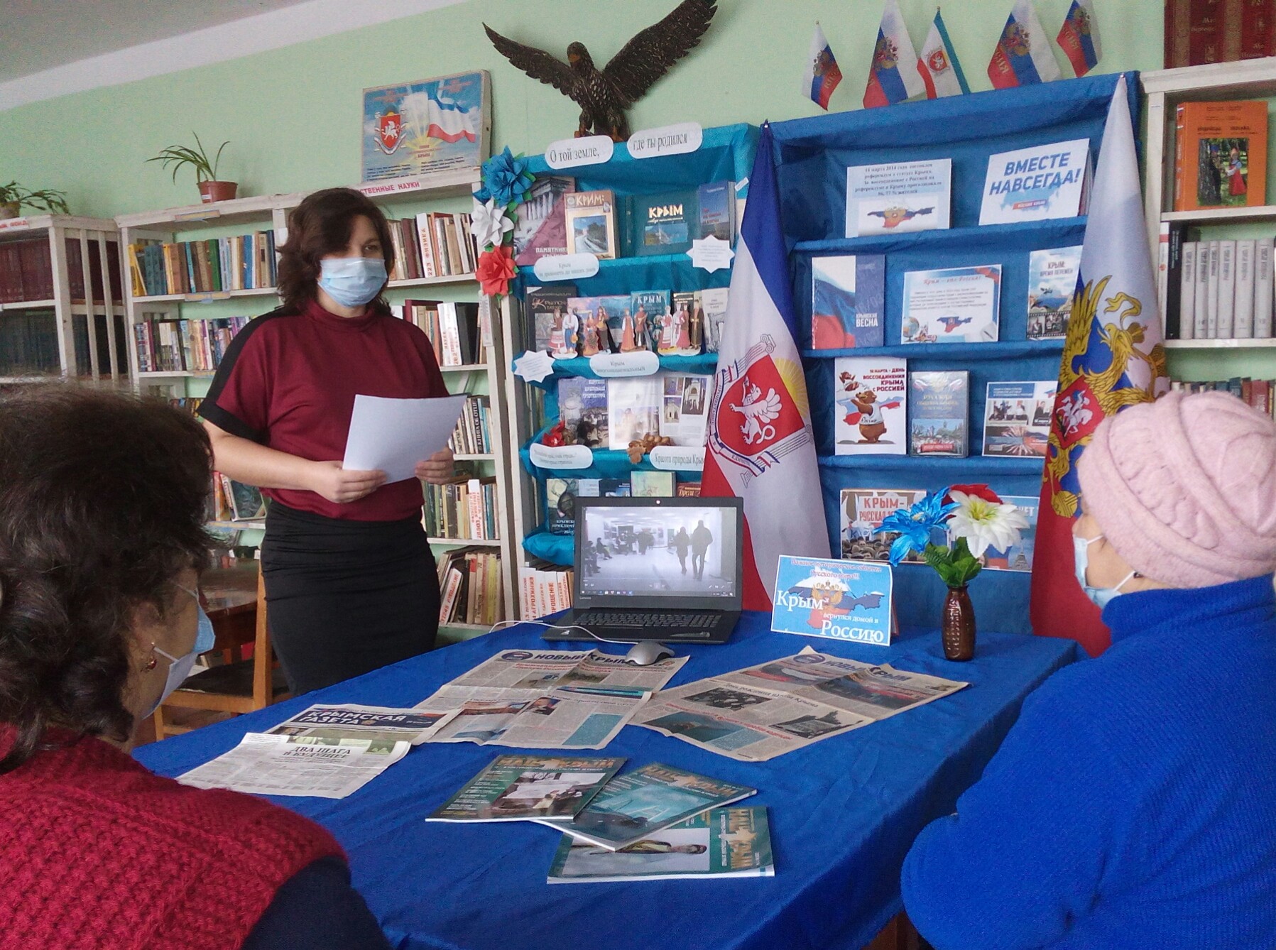 К Дню воссоединения Крыма с Россией, который отмечается в нашей стране 18 марта. В Новостепновской библиотеке состоялся Исторический экскурс «Крымская весна». Библиотекарь рассказала о судьбоносном событии 2014г., когда Крым вышел из состава Украины и воссоединился с Россией. Читатели узнали, как в 1991 году крымчане оказались в другом государстве и как долог был их путь возвращения домой в Россию. Также поведала о достижениях крымчан за 7 лет, проживших бок о бок с Россией. В заключении мероприятия библиотекарь поздравила читателей с праздником. И пожелала им увереннос