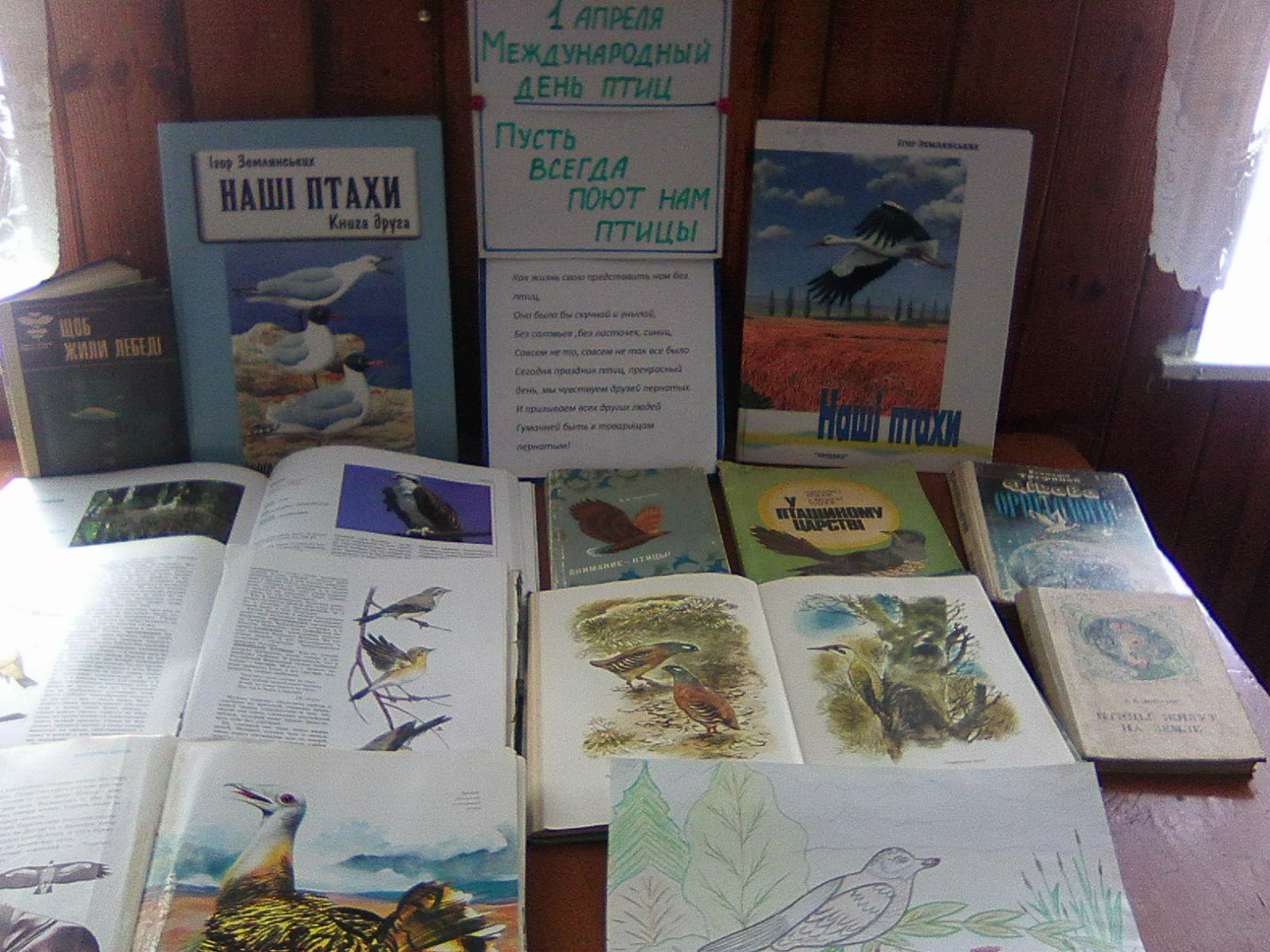 1 апреля-Международный день птиц- праздник единения человека с природой. Человек всегда восхищался как пением птиц, так и их стремлением любыми путями вернуться домой. их верности и заботе о потомстве. К этому дню в Источненской библиотеке, библиотекарем Майстер А.И. была оформлена тематическая полка «Пусть всегда поют нам птицы», на которой представлены различные материалы о птицах, тематическая полка предназначена для массового читателя.