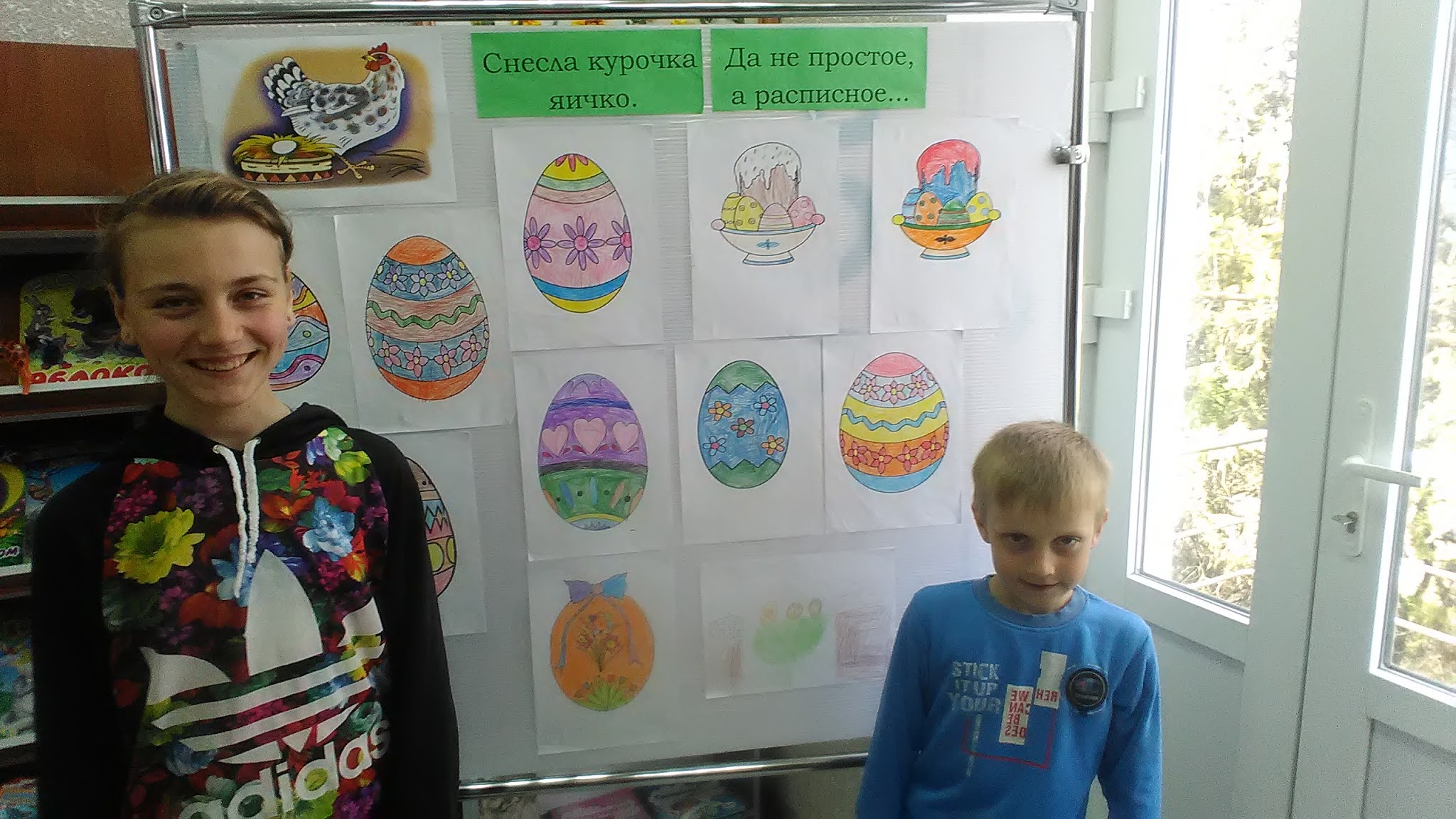 В Новокрымской библиотеке прошел конкурс рисунков «Снесла курица яичко. Да не простое, а расписное», посвященный светлому, весеннему празднику Пасхе. В начале мероприятия заведующая библиотекой Елена Григорьевна Нимчук рассказала детям, что существует несколько способов раскрашивания: крашенки, крапанки, писанки, и предложила самим нарисовать и раскрасить пасхальные яйца.