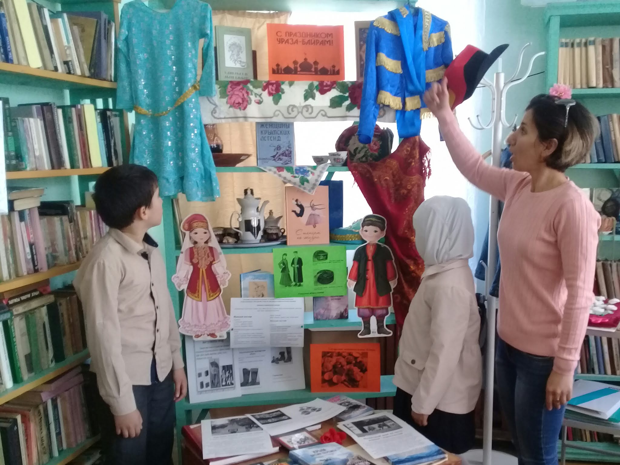 В рамках мероприятия библиотекарь Маллалиева Эльзара Айдеровна ознакомила всех присутствующих с историей праздника, обычаями и традициями . Также рассказала детям о культуре и традициях татар, национальной одежде, кулинарных блюдах. Дети с интересом слушали и бурно реагировали на рассказ, многие знают и видят это дома, в своих семьях.