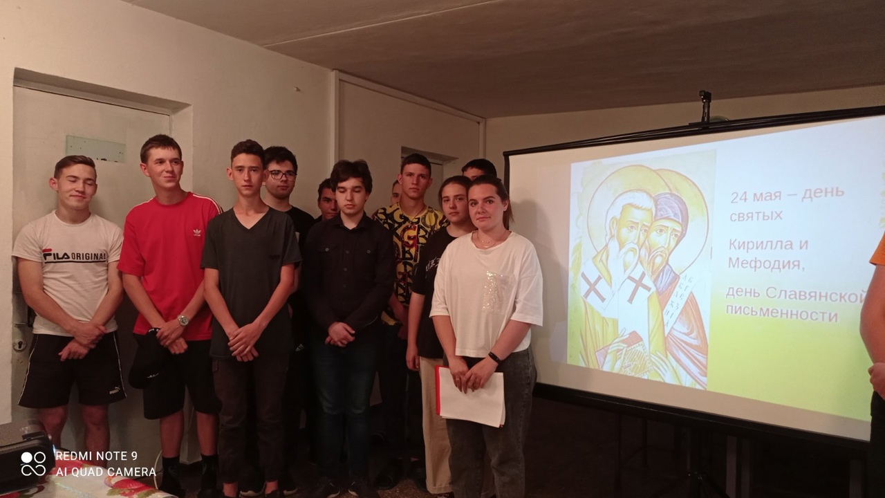 Библиотекарь (Миколайчук Ю.Н) познакомила присутствующих с событиями жизни святых Кирилла и Мефодия, составителями славянской азбуки; рассказала о зарождении письменности, об истоках русской письменности, о славянской азбуке, о первых книгах на Руси, а так же о культурном наследии русского народа и о праздновании Дня славянской письменности и куль