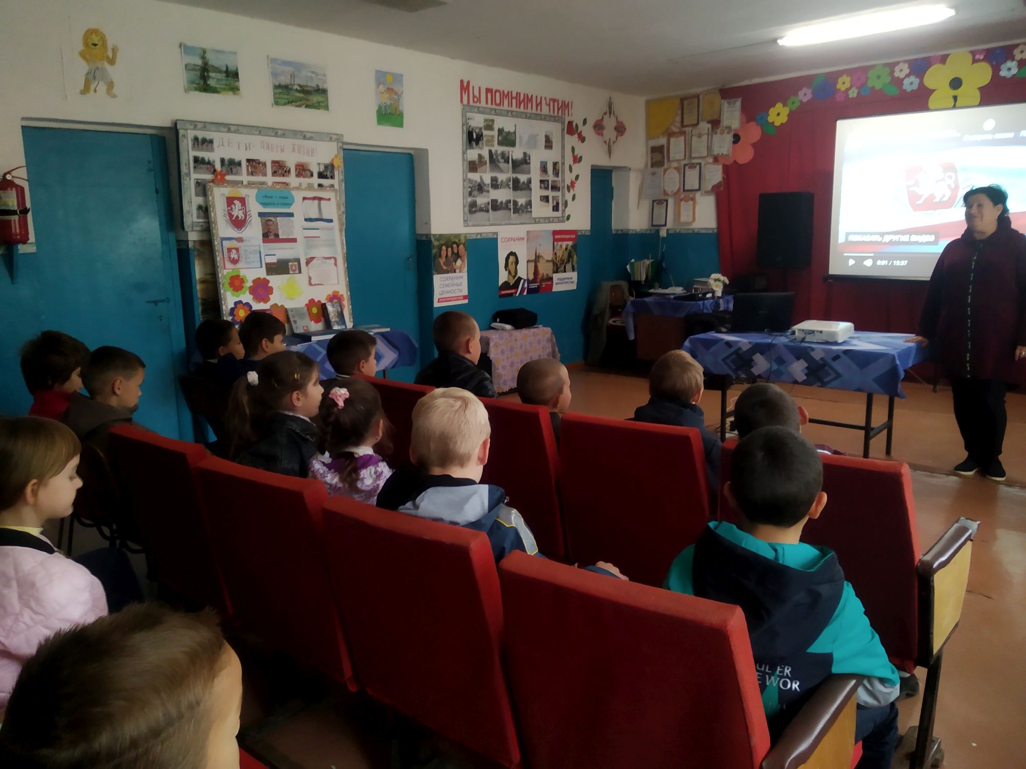 На мероприятии показали детям видеоролик, посвящённый Дню Государственного Герба и Флага Республики Крым, рассказали о появлении первых символов в Крыму, ещё каждый и учеников рассказали, что, по их мнению, обозначает слово Родина.