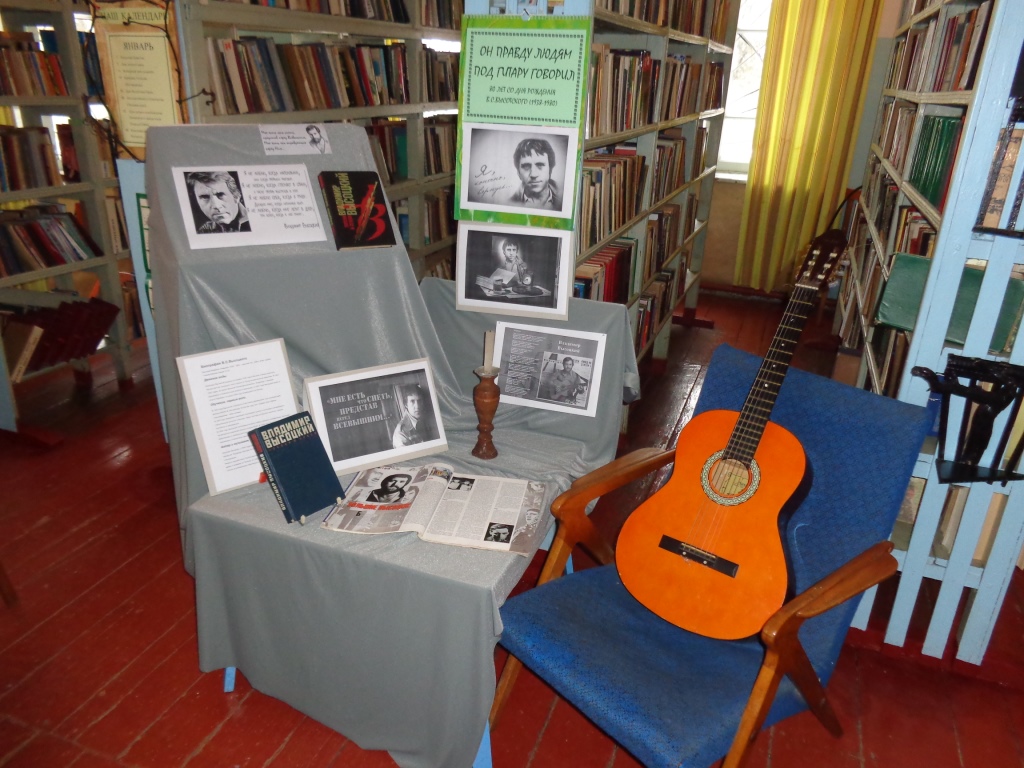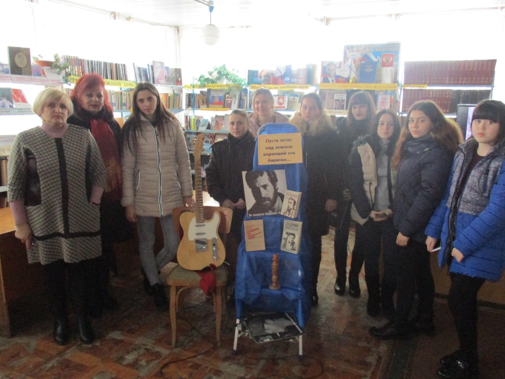 25 января исполнилось бы 80 лет со дня рождения Владимира Семёновича Высоцкого-актёра, поэта, исполнителя своих песен. Его имя и при жизни было легендой, а после смерти именем Владимира Высоцкого называют театры, корабли, планету. 26 января в Ближнегородской библиотеке прошло мероприятие для молодёжи звездопад поэтический «Он правду людям под гитару говорил». Библиотекарь Макарова Елена Владимировна и заведующая сельским клубом Юдичева Марина Станиславовна рассказали присутствующим о жизни и творчестве Владимира Высоцкого. В ходе мероприятия звучали песни юбиляра «Я не люблю», «На Большом Каретном», «Песня о друге», «Он не вернулся из боя», «Братские могилы», «Купола». Учащаяся 10 класса Макарова Полина рассказала стихотворение «Люблю тебя сейчас…». Как точно сказал актёр Михаил Ульянов: «Это удивительно, но никто по-настоящему не пел и не споёт его песни. Нужен его темперамент, нужен этот сложный, странный, надорванный, казалось, уже погибающий голос, которым он пел столько лет, ни разу его не сорвав. И только он мог на таком смертельном пределе вложить всего себя в песню.» К мероприятию была оформлена одноименная выставка. На мероприятии присутствовало 12 человек. Днепровская библиотека 25 января 2018 года исполнилось бы 80 лет актеру, поэту и автору-исполнителю Владимиру Семеновичу Высоцкому. Он- "человек-эпоха", успел за свою короткую, но очень бурную жизнь, стать кумиром миллионов людей, а его песни и стихи до сих пор знают, любят читают и поют. В.С. Высоцкий заряжал своей энергетикой, искренностью, для всех был "своим человеком", его песни были близки людям. 26 января 2018 года в Днепровском клубе совместно с библиотекой прошел литературно-музыкальный вечер "Прерванный полет". Библиотекарь Якименко Л.В. подготовила тематический стенд "Прерванный полет". В начале вечера, в исполнении Якименко Л.В., прозвучало стихотворение " Пророков нет в отечестве моем", написанное сыном В.Высоцкого сразу после смерти в 1980 году. Заведующий клубом Торощин В.И. исполнил несколько песен из репертуара В.Высоцкого. Радевич Л.В., Шпакова С.А., Гринь Катя читали стихи: "Не важен возраст, все имеют цену", "Так случилось, мужчины ушли", "На братских могилах ","И сверху лед, и снизу- маюсь между". В заключении вечера квартет "Сюрприз" исполнили песню "На большой Каретной". Присутствовало на мероприятии 28 человек. Зерновская библиотека