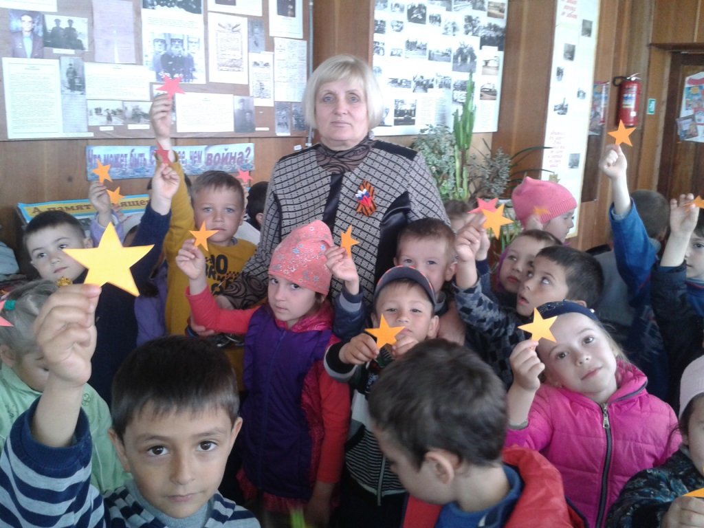 Ребята узнали, что на территории села был концлагерь, что памятник в центре села поставлен односельчанам, погибшим на войне. Заведующая Победненской библиотеки Кареева Татьяна Борисовна показала ребятам письма с фронта, записки узников концлагеря, солдатские каски, боевые награды. Еще ребята услышали рассказ о героях войны и об их подвигах, чьими именами названы улицы нашего села. Это Александр Матроов, Амет-Хан-Султан, Николай Гастелло. В заключении ребята получили по звездочке, что бы дома родители помогли им написать имя родственника, учувствовавшего в Великой отечественной войне. Затем эти звездочки прикрепятся на большом стенде в библиотеке. Все желающие могут принять участие в этой акции. А 9 Мая на митинге возле Памятника односельчанам всегда выстраивается очередь из желающих прикрепить звездочку. Ведь пока мы помним, мы остаемся людьми.
