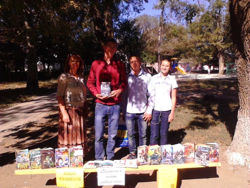 В рамках литературного фестиваля «КрымБукФест - 2016» библиотекари центральной районной библиотеки А.Кологреева, З.Абибуллаева и Л.Данильченко на территории городского парка провели акцию буккроссинга «Писатели и поэты родного края». На скамейках были размещены на радость всем прохожим самые интересные книги и журналы, сборники стихов наших земляков В. Волобуевой, Т. Малининой, исторические рассказы В. Турчина и биографические справки, статьи, фото талантов Крыма.