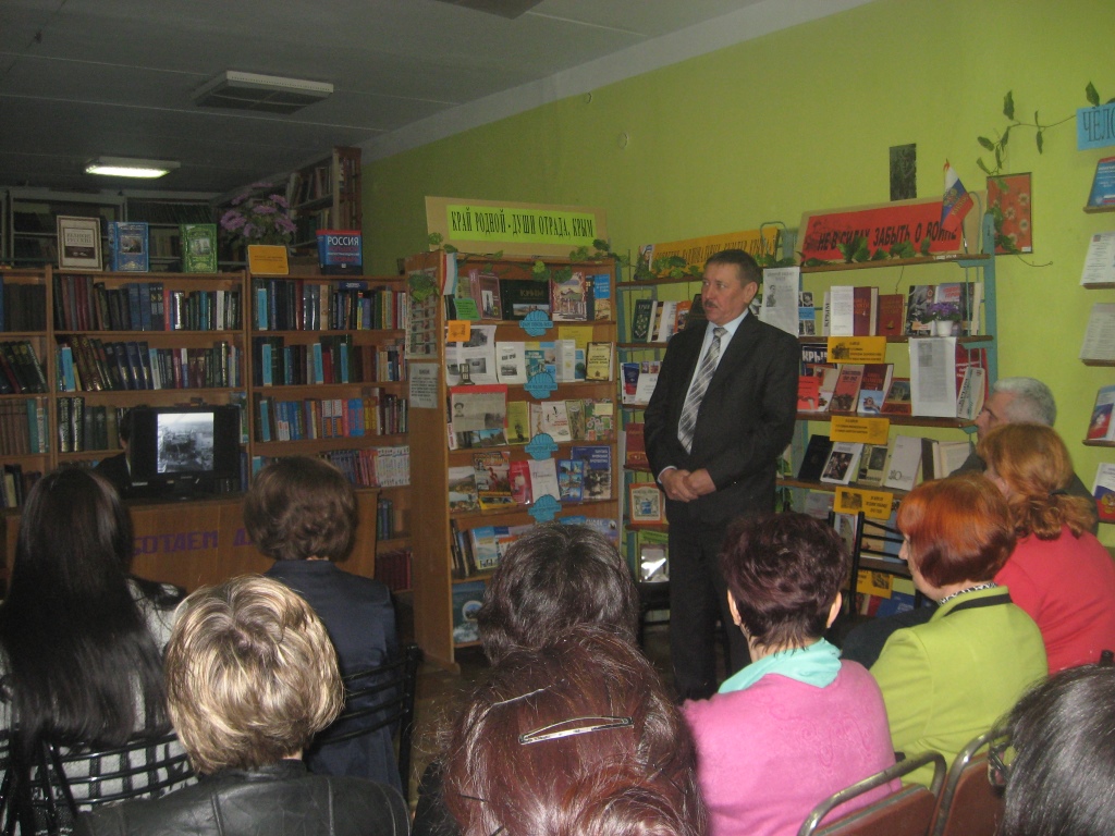 Накануне тридцатилетия Чернобыльской трагедии, в центральной районной библиотеке прошел час памяти «Чернобыль – боль и тревога». На этой памятной годовщине присутствовали: Глава администрации Джанкойского района Республики Крым Александр Иванович Бочаров, начальник департамента труда и социальной защиты населения администрации Джанкойского района Республики Крым Наталья Мелентьевна Буженинова, Начальник отдела культуры межнациональных отношений и религий администрации Джанкойского района Ирина Владимировна Корнейчук, директор МКУК районной центральной библиотечной системы администрации Джанкойского района Республики Крым Елена Николаевна Кучерявая и заместитель председателя Общероссийской общественной организации инвалидов союза Чернобыль Александр Иванович Смирнов.