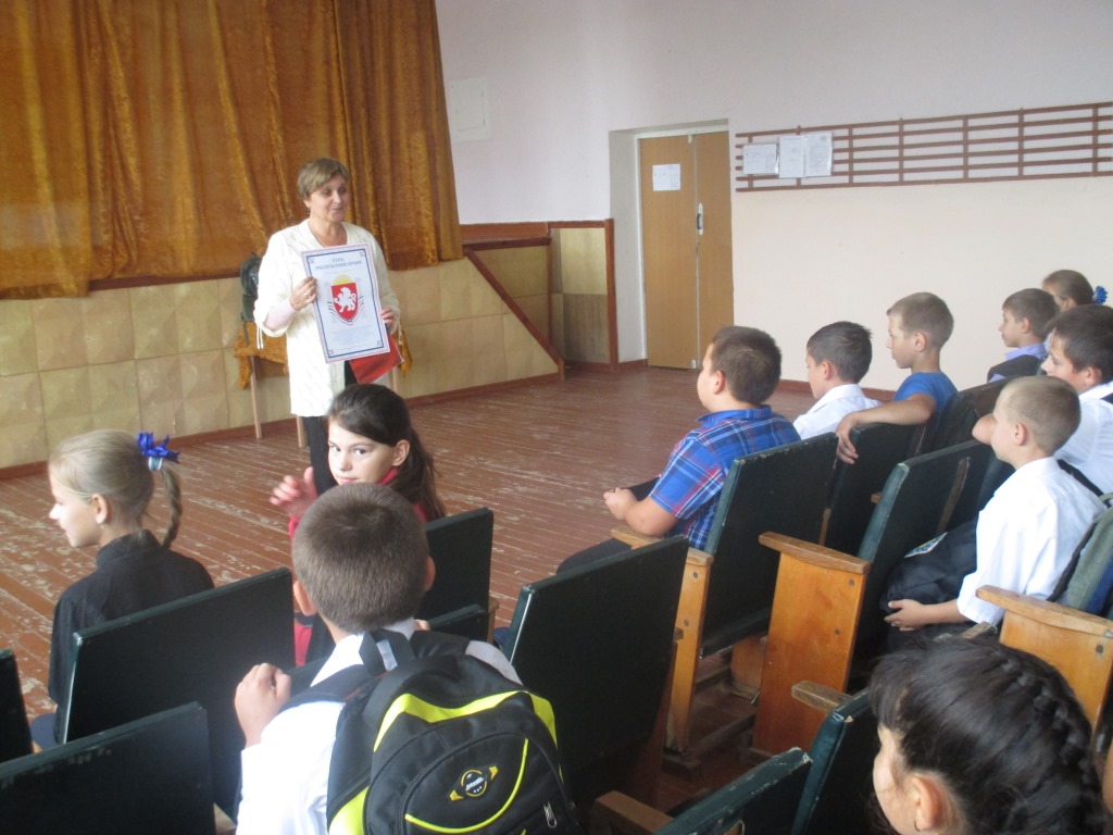 В канун празднования Дня Государственного герба и флага Республики Крым заведующая Луганской сельской библиотекой Павицкая Светлана Степановна провела для учащихся 6 класса час Отечества «Два символа на фоне истории». Вначале мероприятия библиотекарь ознакомила ребят с историей возникновения современной символики Республики Крым, раскрыла значение государственных символов. Рассказала детям, что мы все являемся гражданами Республики Крым и должны знать и почитать символы нашей государственности, ведь символы – это условные знаки, имеющие для человека и для целого народа важное значение. Эти символы достались нам от предков, и какими они станут в будущем, зависит только от нас.