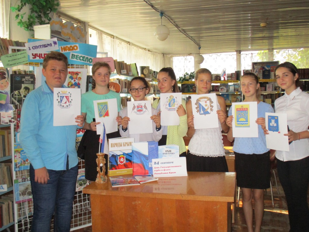 Районная библиотека В преддверии Дня Государственного флага и герба Республики Крым, который отмечается 24 сентября, в Джанкойской районной библиотеки для учащихся дорожно- строительного техникума был проведен патриотический час « Символы республики и история Крыма». Библиотекарь читального зала А. Кологреева подготовила историко-документальный рассказ об основных символах нашей республики. Полученный знания ребята закрепили просмотром видеоклипов по истории Крыма, также в библиотеки была оформлена книжно-иллюстративная выставка « Герб. Флаг. Крым», на которой представлена литература по истории Крыма, копии документов, иллюстрации. Присутствовало 18 человек