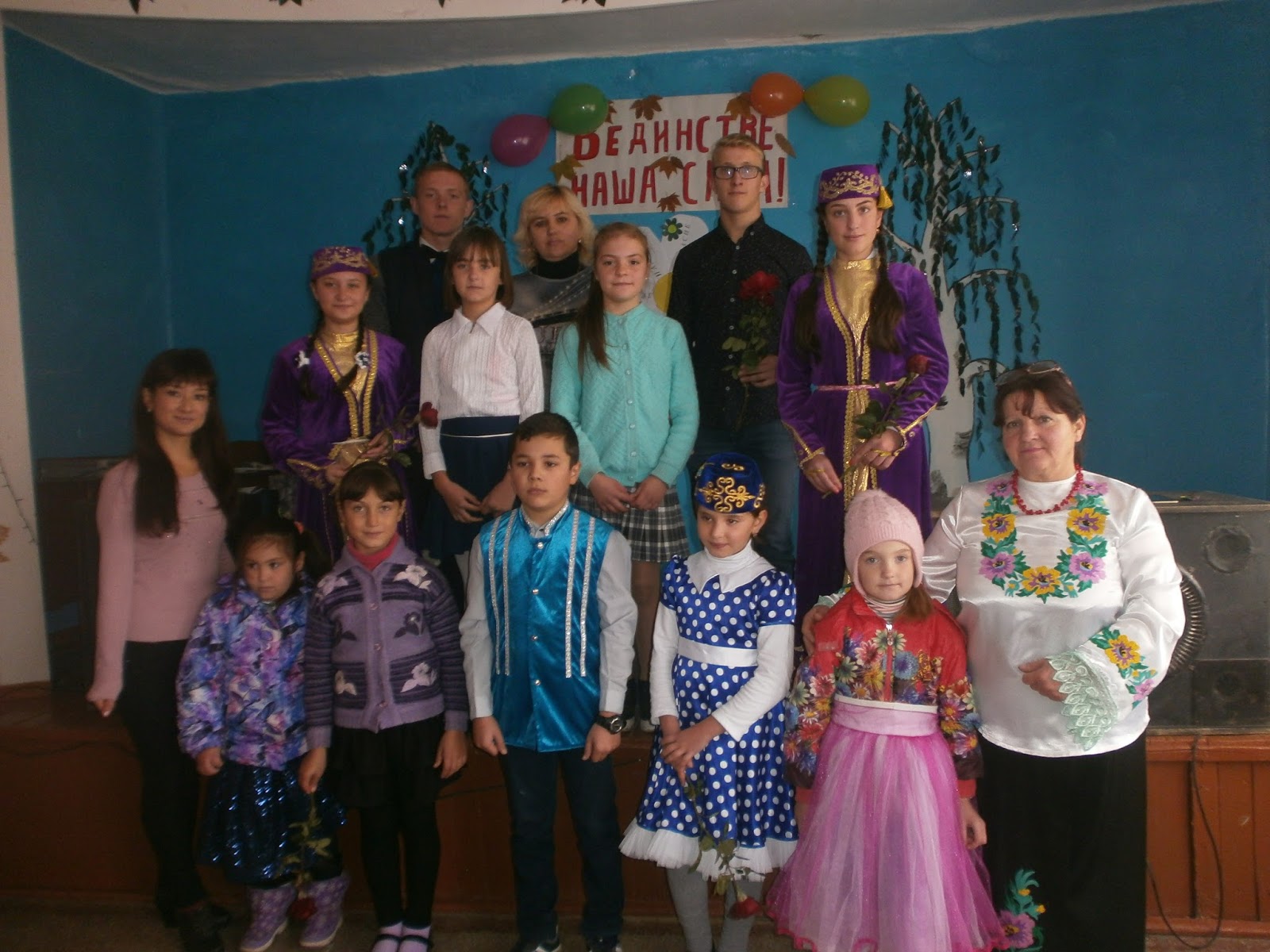 Луганская библиотека В рамках празднования Дня народного единства 4 ноября в Луганском ДК прошёл патриотический вечер «Мы разные, но мы вместе». Перед началом праздника с поздравлением выступила Председатель сельского Совета Аметова Асие Аметовна она поздравила всех присутствующих с праздником и подарила юным артистам, за их яркие таланты большой и вкусный торт. В начале мероприятия заведующая Луганской сельской библиотекой Павицкая Светлана Степановна провела экскурс в историю празднования Дня единства и подготовила книжную выставку « Единство разных». Белецкие Даниил и Османов Руслан с вдохновением прочли стихотворение «Единство». На протяжении всего мероприятия звучали песни: «Доброта», «Давай полетаем», Крым – чудо страна», «Дети Земли», «Мир глазами детей» и другие. В заключении все участники концерта исполнили песню «Я, ты, он, она». На празднике присутствовало – 25 человек.