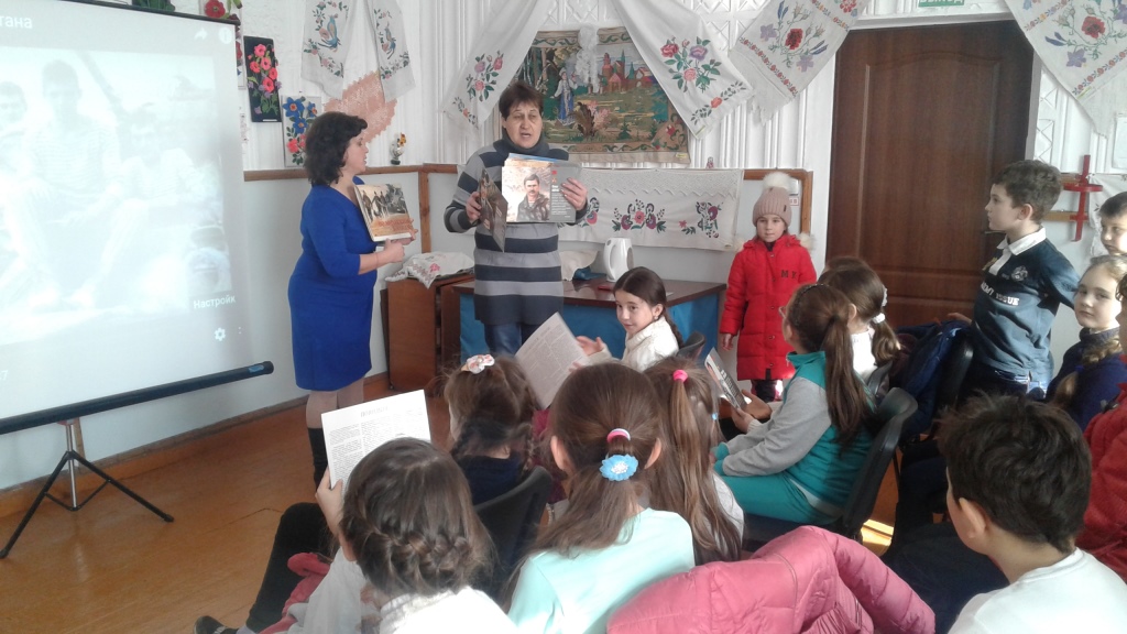 Крымковская библиотека Ушла в историю афганская война. Но не остались забытыми события тех дней, её солдаты, герои.15 февраля в доме культуры села Крымка был проведён час памяти «Афганистан – ты боль моей души…», посвящённый 29-й годовщине вывода советских войск из Афганистана. Узнать о войне, которая длилась почти 10 лет, пришли учащиеся 3-5 классов. Библиотекарь Крымковской библиотеки Бойчук Лариса Валентиновна и художественный руководитель ДК Кенжеева Сание Асановна постарались просто и понятно рассказать школьникам о событиях « Афганской» войны и об её участниках, сопровождая свой рассказ показом мультимедийной презентации «А память сердце бережет». На фоне общих сведений об Афганистане, подробно было рассказано об участнике тех грозных событий воинах-интернационалистах, которые с достоинством выполняли свой воинский долг в данный момент проживающих в селе Крымка: Гумённом Олеге Викторовиче, Соловье Александре Михайловиче, Кичкируке Анатолие Сиргеевиче, Антуле Викторе Владимировиче. В заключение мероприятия ребята посмотрели видеоролик «Прощай Афганистан». Присутствовало 15 человек.