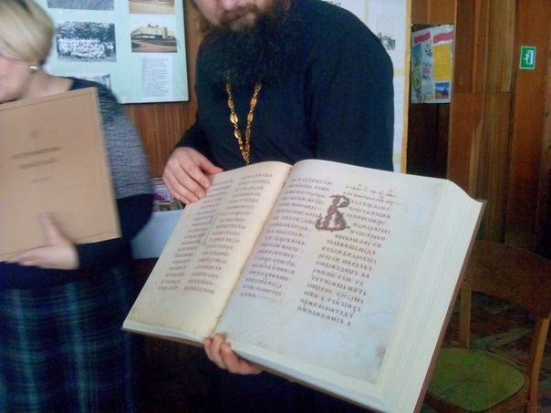Заведующая библиотеки Кареева Т.Б. познакомила гостей праздника с книжной выставкой «Живое слово мудрости духовной», рассказала ребятам о понятии духовная литература и православная книга. На праздник к ребятам приехал очень почетный гость . Это настоятель Храма Благовещения в с. Победное Отец Димитрий. Его слово о важности книги ребята слушали очень внимательно. А еще больше ребят поразил подарок, который был преподнесен Святым Отцом. Это точная копия Евангелии, написанная монахами в 1055 году. Конечно, на празднике были и конкурсы и игры и загадки. И фотография на память.