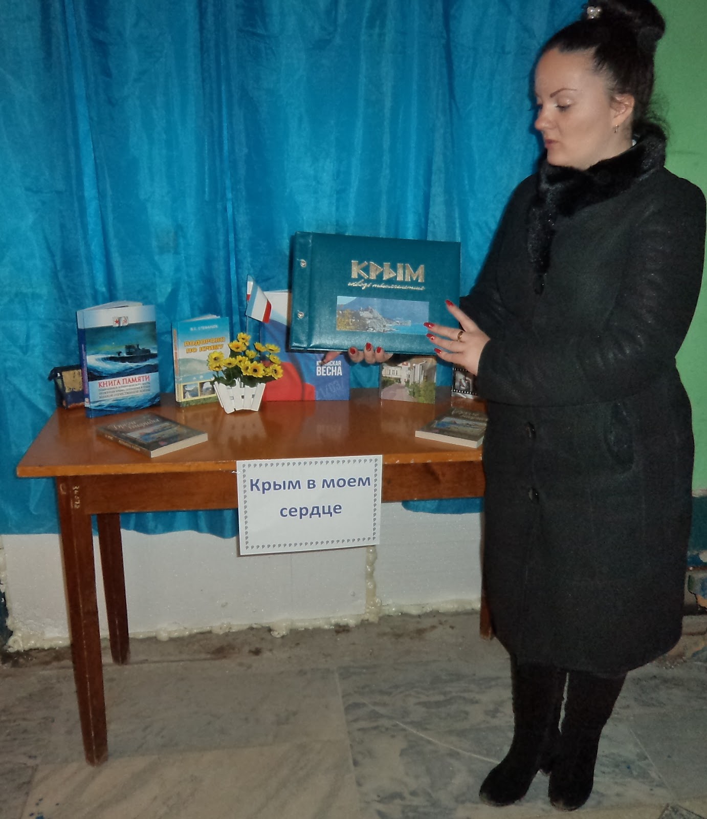 Библиотекарь Миколайчук Ю.Н. подготовила для присутствующих книжную выставку "Крым в моем сердце", рассказала о живописных уголках природы Крыма. В заключение для всех прозвучало стихотворение крымского поэта В.Субботенко "Отчизны краешек особенный...", а также множество душевных поздравлений с этим замечательным праздником.