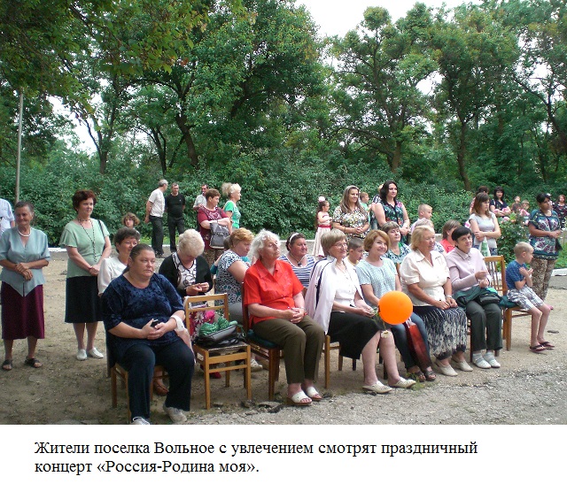 работниками Вольновского Дома Культуры совместно с библиотекарем Вольновской поселковой библиотеки Карпекиной Юлией Анатольевной, в преддверии праздника, во дворе Дома Культуры был проведен концерт, посвященный Дню России, под названием «Россия-Родина моя!».