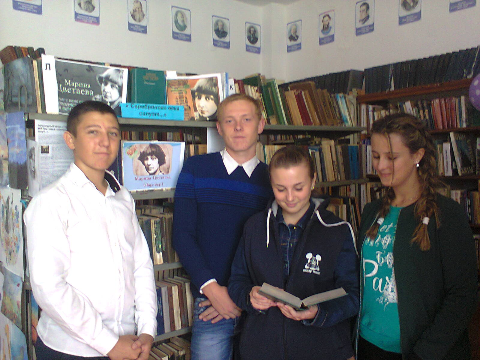 Яснополянская сельская библиотека В Яснополянской сельской библиотеке прошел литературный вечер для молодежи посвященный 125-летию со дня рождения Марины Ивановны Цветаевой под названием "Серебрянного века силуэт...» или жизнь и бытие Марины Цветаевой, подготовлен библиотекарем Пуляевой Натальей Любомировной. В вечере представлены биография и творчество Марины Ивановны в литературной презентации. Ребята с большим удовольствием слушали рассказ библиотекаря о трагической судьбе российской поэтессы, читали ее стихи. Ученики 11 класса с выражением прочли стихотворение «Мне нравится, что вы больны не мной...» Литературный вечер прошел в веселой, дружеской обстановке. На мероприятии присудствовало 10 человек и выдано 5 экземпляров. | |
