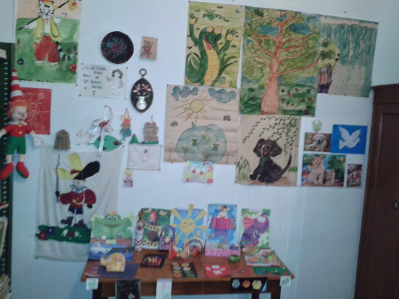 В викторине: "Мир птиц" для учащихся 2-4 классы призовые места заняли- 1 место занял Мызгин Лаврентий - 2 кл.,2 место - Скакун Яна - 2 кл.,3 место - Третьякова Ирина - 2 кл. А в конкурсе рисунков: "Герои любимых книг" - 1 место заняла Сиренко Александра - 9 кл.,2 место - Пипченко Анна - 7 кл.,3 место - Третьякова Ирина - 2 кл. В библиотеке были оформлены тематическая полка к викторине: "Мир птиц", книжная выставка: "Путешествие в Читай город" - для детей 2-4 класс. Дети познакомились и взяли почитать сказки, пословицы, заглянули в далёкое прошлое нашего народа. Во время каникул ребятам скучно не было. Они изготовляли поделки и дополнили ими выставки поделок: "Умелые руки не знают скуки", "Сделано с любовью".