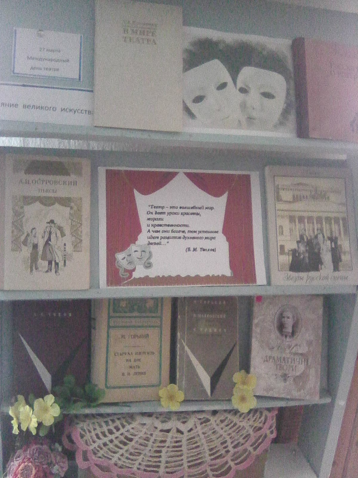 Международный день театра. Театр -уникальный вид искусства, который сочетает в себе литературу, музыку, хореографию. Театр наполняет будни волшебством, позволяет окунуться в сказку. Для массового читателя, библиотекарем Майстер А.И. оформлена тематическая полка «Сияние великого искусства». | |