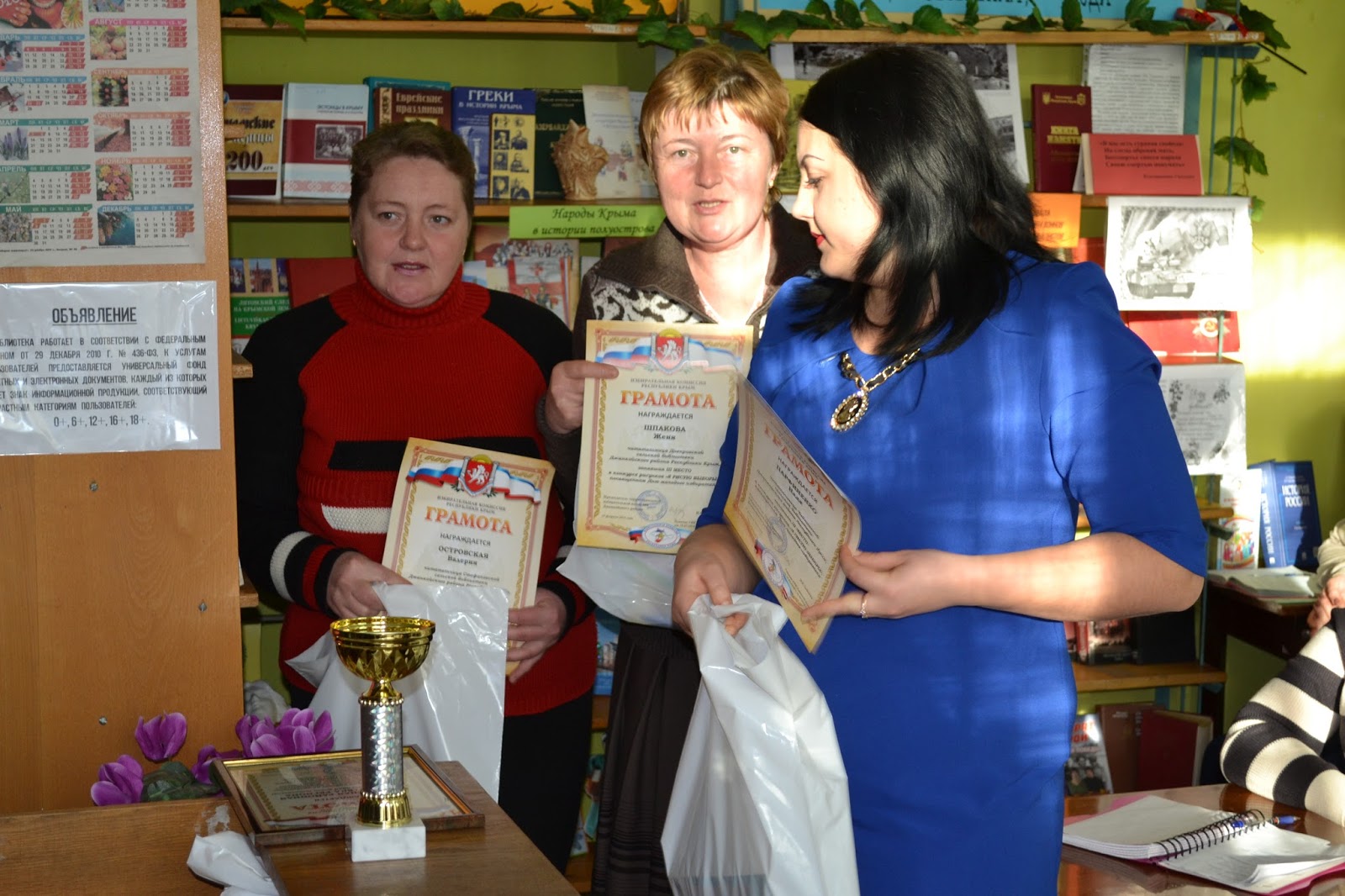 Не остались без наград и библиотекари. Центральной районной библиотеке за организацию работы по проведению конкурса детских рисунков и тематических выставок ко Дню молодого избирателя были вручена Грамота и Кубок. За активное участие в конкурсе «Я рисую выборы» были отмечены и сельские библиотекари - Д.Э.Джемилова (Дмитриевская библиотека), И.В.Дорох (Низинненская библиотека), Т.И.Иванова (Просторнеская библиотека), Н.Л.Пуляева (Яснополянская библиотека).