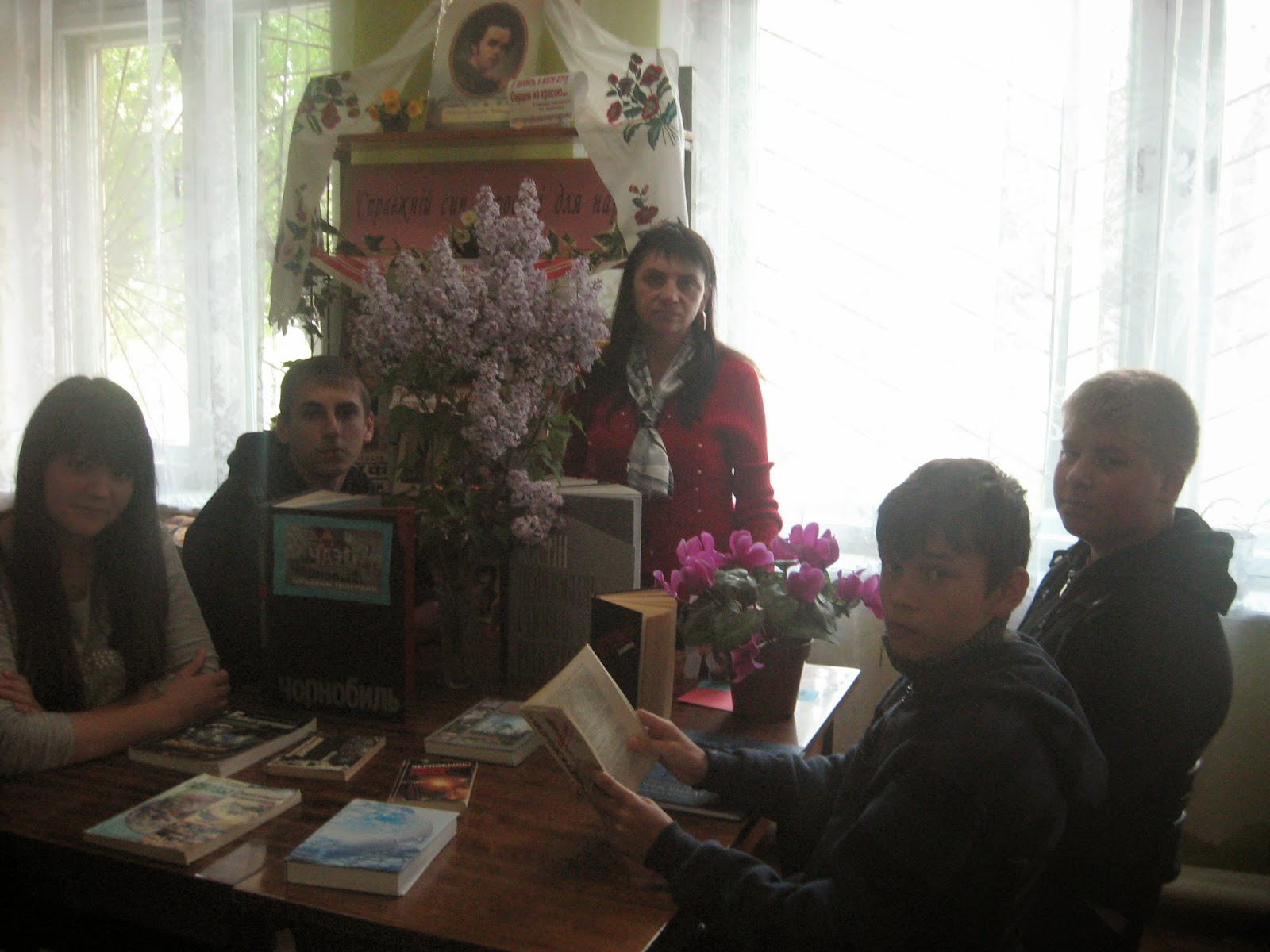 В читальном зале районной библиотеки оформлена книжная выставка «Чернобыль: отзвуки трагедии», посвященная Чернобыльской трагедии. Библиотекарь отдела обслуживания Л. Данильченко, для школьников и лицеистов 25 апреля провела час экологии «Колокола Чернобыля». Молодые люди ознакомились с газетными публикациями, копиями документальных материалов, посвященных этому событию, еще раз осознав, насколько страшны последствия катастрофы, случившейся 28 лет назад на Чернобыльской АЭС.