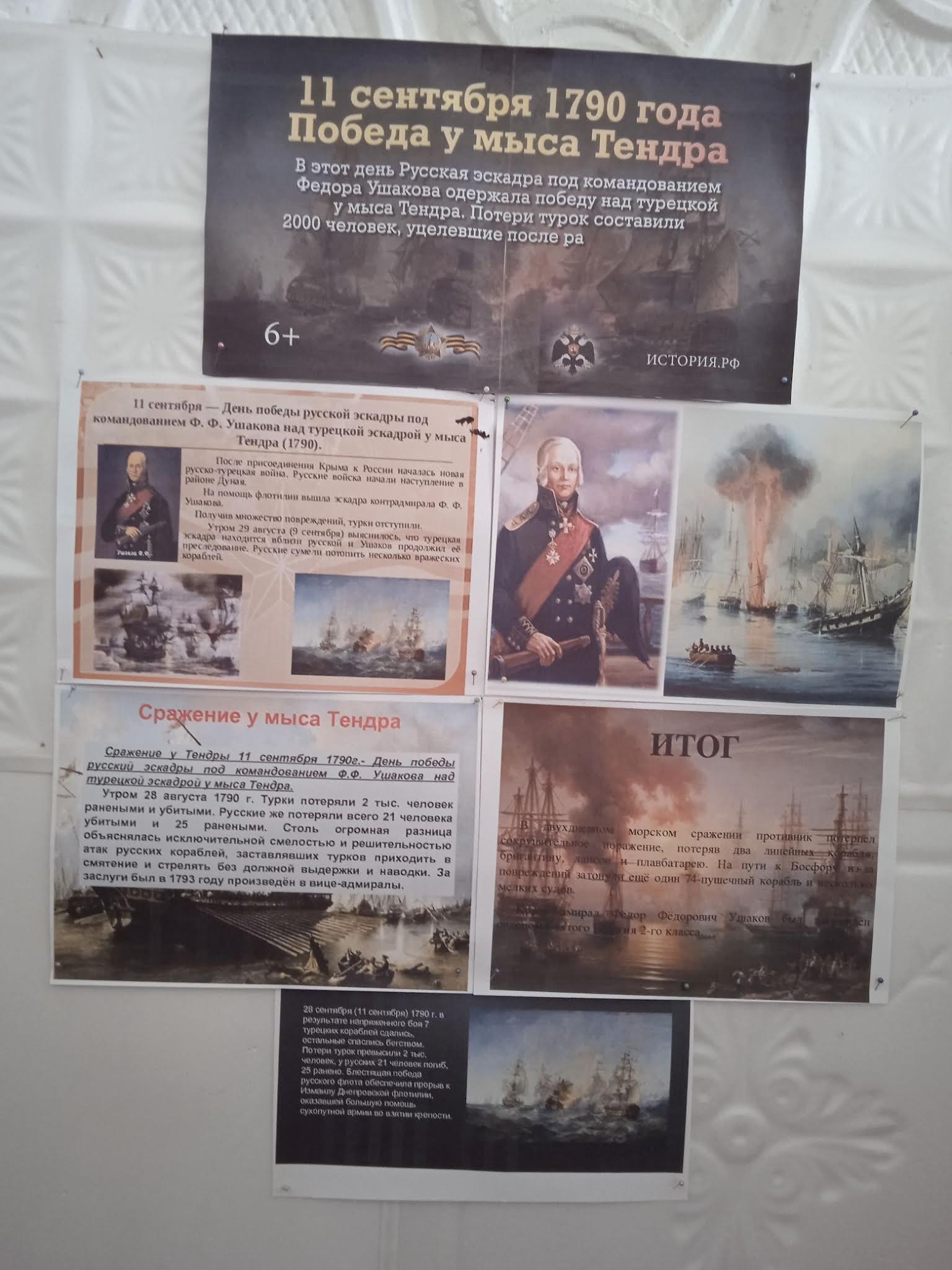 11 сентября в России отмечается День победы русской эскадры над османским флотом у мыса Тендра. В сражении, которое проходило 8—9 сентября 1790 года, морякам под командованием контр-адмирала Фёдора Ушакова удалось обратить противника в бегство, хотя у турков было значительно больше орудий. В ходе русско-турецкой войны 1768-1774 годов к России был присоединен Крымский полуостров. Россия начинает создание Черноморского флота и соответствующей прибрежной инфраструктуры. Началась новая русско-турецкая война. В русско-турецкой войне 1787-1791 годов русским сухопутным силам успешно содействовал Черноморский флот под командованием контр-адмирала Федора Ушакова. Одним из важнейших событий этой войны стала победа русской эскадры над турками у мыса Тендра в северо-восточной части Черного моря. К этой дате в в Крымковской сельской библиотеке подготовлен календарь-листовка «Календарь истории».