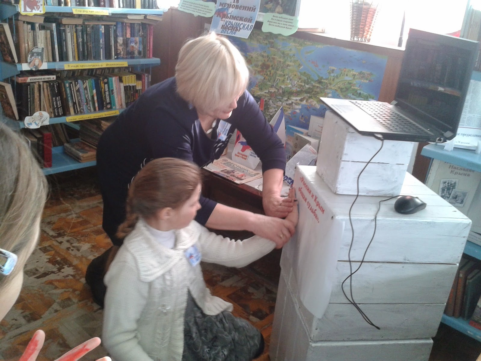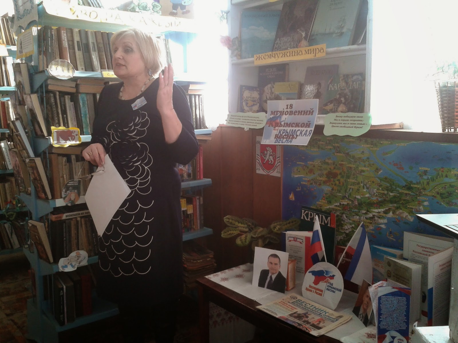 Библиотекарь Бойчук Л.В. рассказала о том, что 16 марта 2014 года в Крыму состоялся референдум о его правовом статусе. В голосовании приняло участие более 82 % избирателей, более 96 % высказалось за воссоединение с Россией. 21 марта 2014 г. президентом РФ был подписан Федеральный конституционный закон «О принятии в Российскую Федерацию новых субъектов – Республики Крым и города федерального значения Севастополя». Показала видеофильм «Присоединение Крыма к России до и после…». В библиотеке была оформлена тематическая выставка «Из глубин Российской истории».