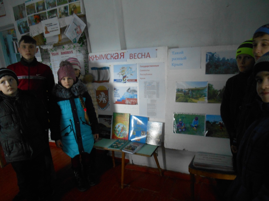 Урок патриотизма «Россия и Крым - вместе навсегда» проведен 16 марта в Ковыльновской сельской библиотеке. Мероприятие было направлено на информирование детей и молодежи о новой памятной дате в истории России - Дне присоединения Крыма и России, на развитие чувства гордости за свою страну, рассмотрение особенностей исторического и культурного единства Республики Крым и города Севастополя с Российской Федерацией. Библиотекарь Науменко Галина представила результаты референдума, организованного жителями полуострова, на котором было принято решение о воссоединении Крыма с Россией. Также была оформлена книжная выставка «Крымская весна» Присутствовало 10 человек
