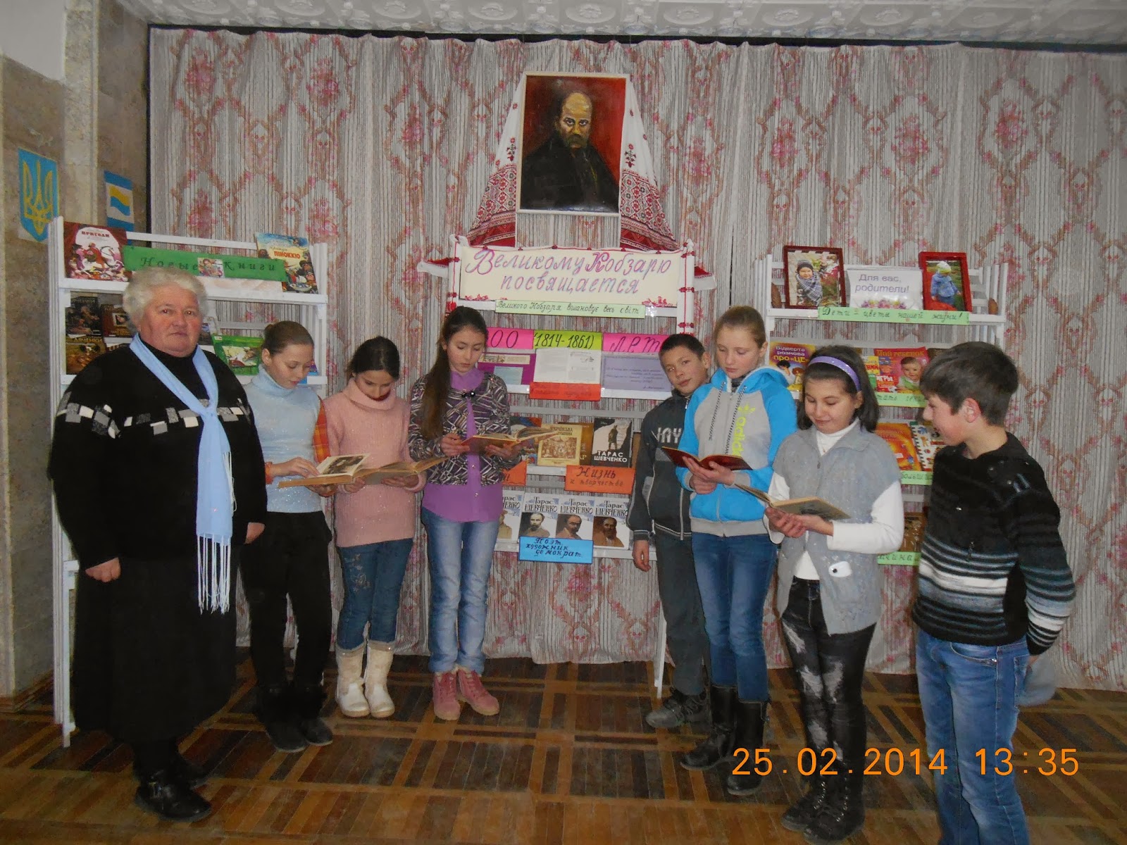 Литературный час для учащихся шестого класса Чайкинской общеобразовательной школы «Судьба детей в произведениях Тараса Шевченко», посвященный 200-летию со дня рождения Т.Г. Шевченко прошёл в Чайкинской сельской библиотеке (заведующая библиотекой Наталья Ивановна Лузан). С детством и отрочеством поэта ребят познакомила учитель Людмила Семеновна Радионова. В исполнении учащихся Эльзары Атамановой, Виктории Волотовской, Салие Азизовой, Богдана Жуковец, Диляры Атамановой, Анастасии Огарковой прозвучали стихи Тараса Григорьевича Шевченко: «Мені тринадцятий минало...», «І золотої й дорогої...», «А.О. Козачковському», «І досі сниться: під горою...», «Як би ви знали паничі...». Завершился литературный час экскурсией по выставке-экспозиции «Великому Кобзарю посвящается», на которой кроме книг был представлен портрет Т.Г. Шевченко, написанный директором Дома культуры Валентином Ивановичем Байдой. | |