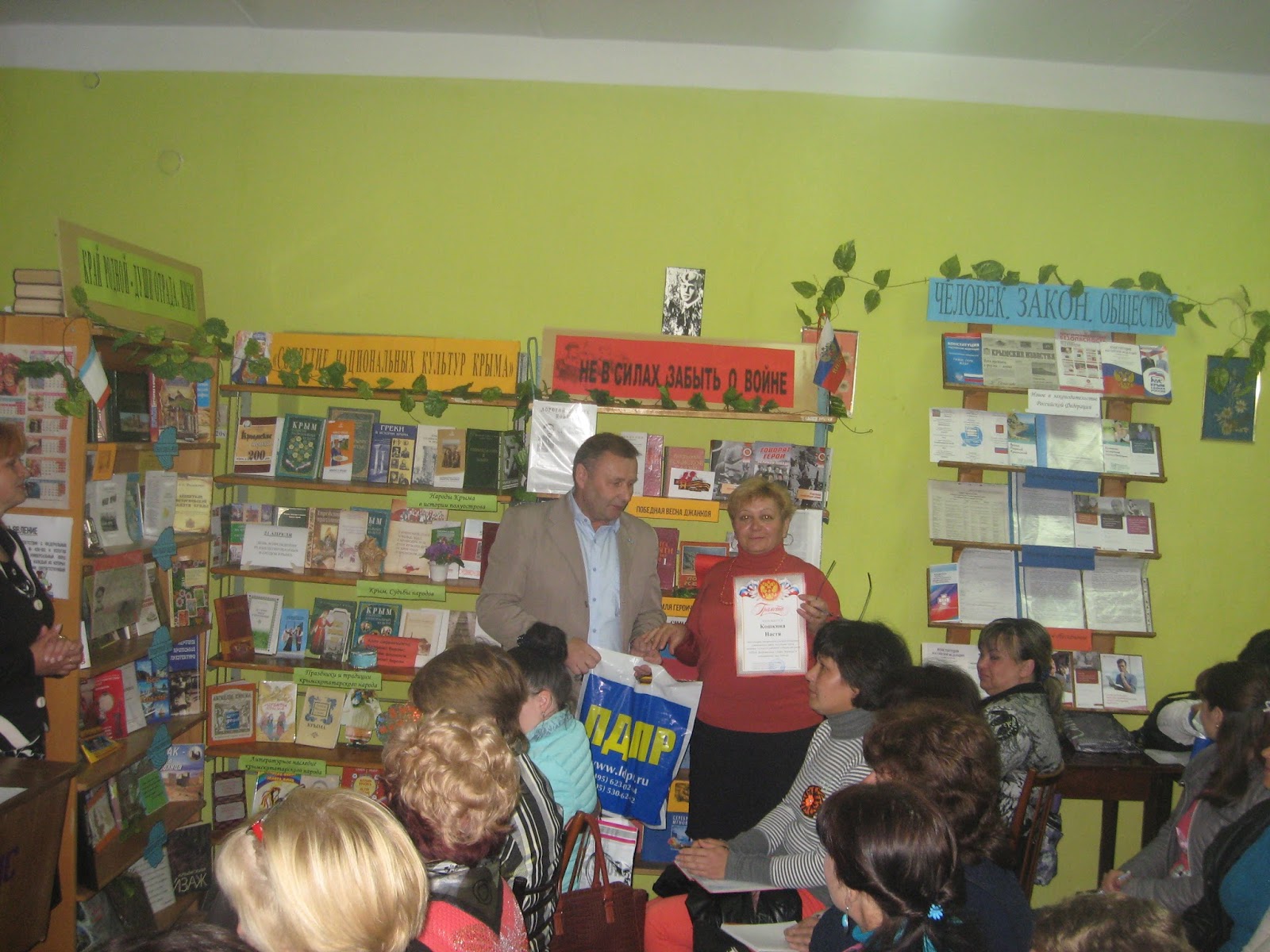 Подведение итогов выставки-конкурса состоялось на совещании библиотекарей района. Перед присутствующими выступил руководитель фракции Политической партии ЛДПР Джанкойского отделения Кривошеев В.В. В своём выступлении Владимир Васильевич отметил, что Великая Отечественная война - величайшее историческое событие, которое принадлежит не только прошлому, но и нашему новому поколению, рассказал присутствующим о значении воспитания патриотизма среди детей и молодежи, и вручил грамоты и ценные подарки победителям конкурса детского плаката:
