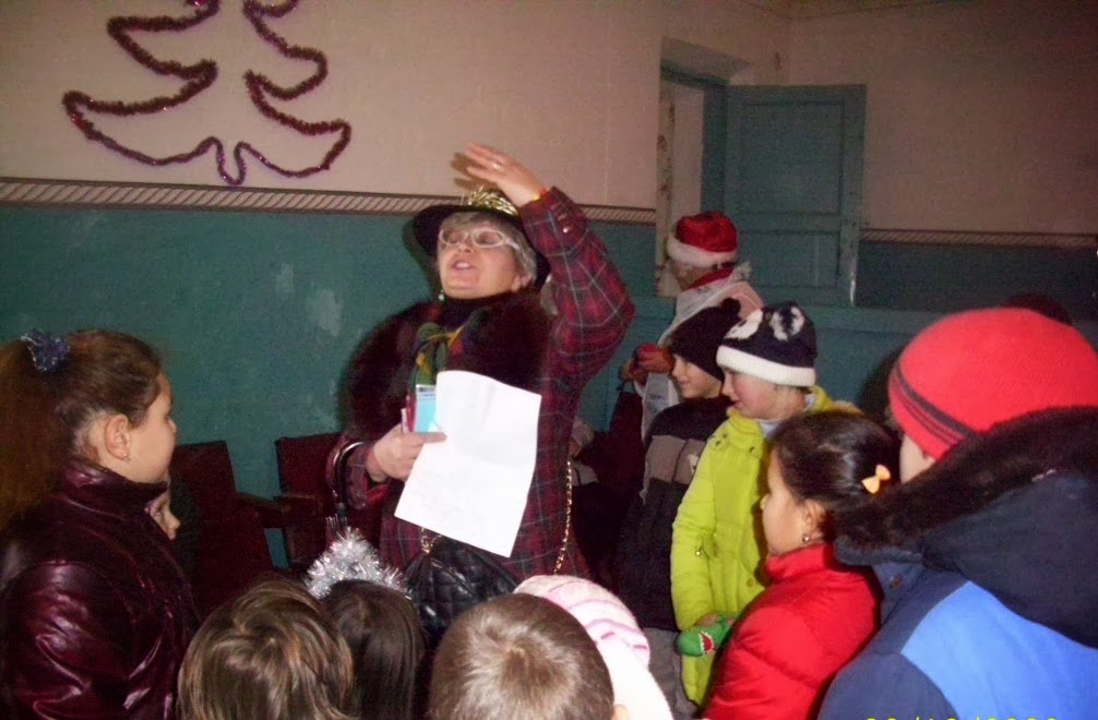 На утреннике была показана сценка «Шапокляк и Баба-Яга», где в роли сказочной старухи Шапокляк выступила сельский библиотекарь С. Г. Азаман и провела конкурс загадок с подвохом на тему «Новогодний серпантин». Детям были розданы сладкие подарки, мягкие игрушки и другие призы.
