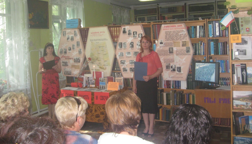 Ведущие вечера памяти, заведующая отделом обслуживания Любовь Данильченко и библиотекарь читального зала Алла Кологреева рассказали, что война постепенно уходит в прошлое, становится лишь страницей истории и что пройдут века, десятки веков, но народная память будет также свежа, как свежи цветы на братских могилах и также вечна, как вечен огонь, зажженный Родиной у подножий обелисков венчающих воинскую славу ее известных и неизвестных солдат и верных защитников.