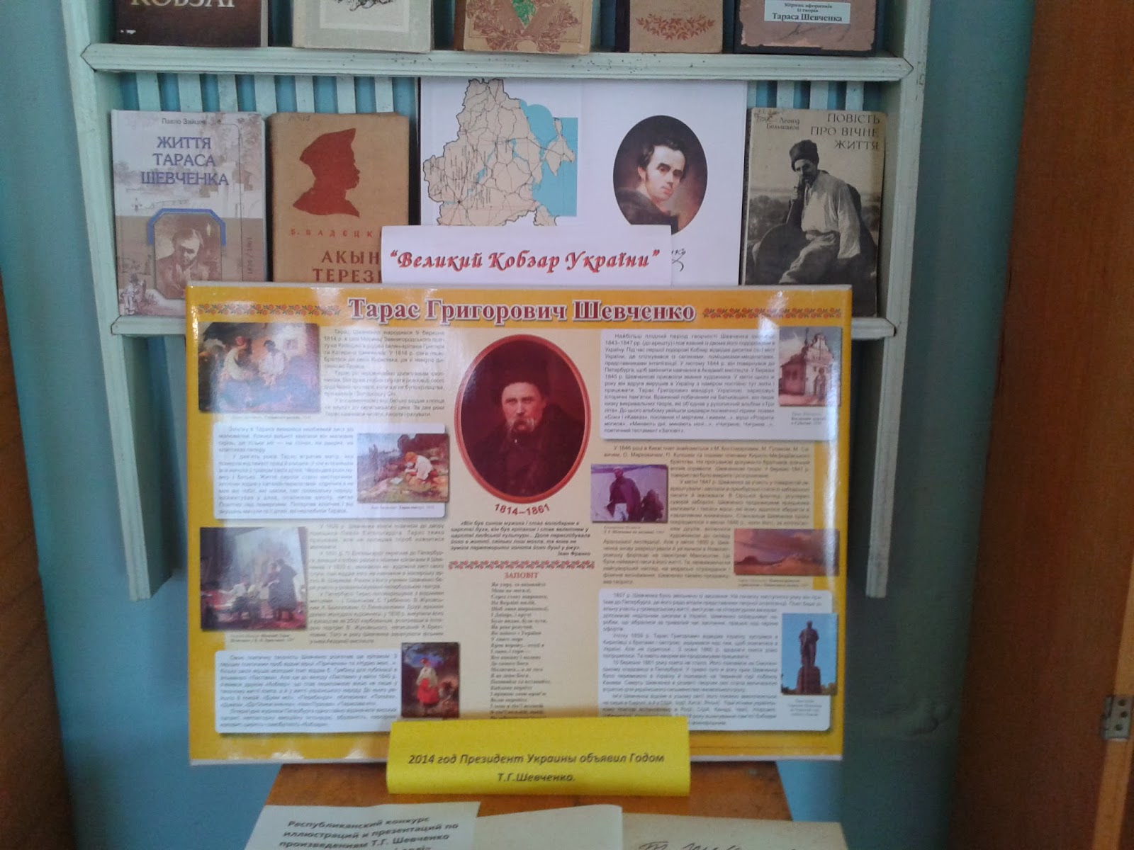 К 200-летию со дня рождения Т. Г. Шевченко 17 февраля 2014года в сельской библиотеке с. Ближнегородское для читателей 5-7 кл. была проведена викторина « Жизнь и творчество Тараса Шевченко». Библиотекарь Макарова Е. В. Провела конкурс знатоков жизни и творчества великого поэта. Дети приняли активное участие в мероприятии Слушая и отвечая на вопросы библиотекаря дети закрепили свои знания о Т. Г. Шевченко, как о поэте, художнике, писателе. Активное участие приняли учащиеся 6кл.: Лелеко А. , Макарова П., Баранов Д., Санжаков А., Куценко М. | |