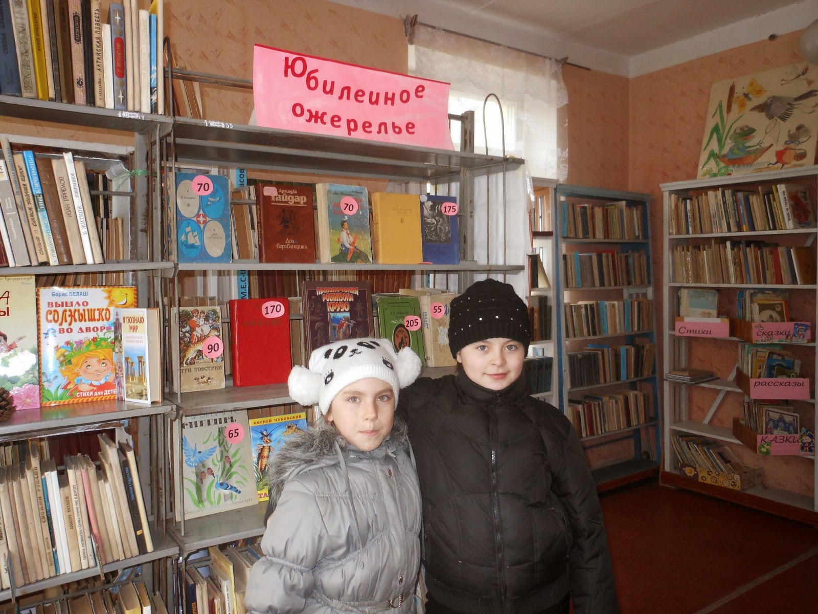 Вниманию детворы была предложена красочная книжная выставка-поздравление «Юбилейное ожерелье». Среди книг–юбиляров – вечная «Сказка о золотом петушке» А.С.Пушкина, увлекательные сказки о природе Виталия Бианки «Лесные домишки», «Чей нос лучше?», «Чьи это ноги?» и «Кто чем поёт?», стихотворные сказки К.Чуковского «Крокодил», «Муха Цокотуха» и «Айболит», любимая детьми и взрослыми «Снежная королева» Г.Х.Андерсена, сказочная повесть «Три толстяка» Ю.Олеши, сказы «Малахитовая шкатулка» П.Бажова, весёлая и добрая трилогии Н.Носова о Незнайке, рассказ «Чук и Гек» А.Гайдара, детская книга английского математика и писателя Л. Кэрролла «Алиса в Зазеркалье», фантастический роман «Двадцать тысяч лье под водой» Жюль Верна, приключенческий роман «Три мушкетера» А.Дюма.